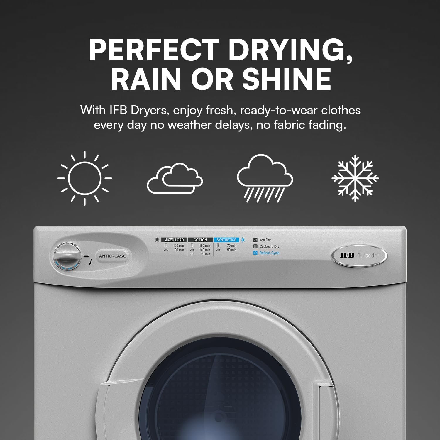 FB 5.5 Kg Dryer Only, Fully Automatic Front Load, Refresh Cycle, Knob Control, Wall Mountable (Turbo Dry EX, Anti-Crease, Germ-Free Drying, Silver)FB 5.5 Kg Dryer Only, Fully Automatic Front Load, Refresh Cycle, Knob Control, Wall Mountable (Turbo Dry EX, Anti-Crease, Germ-Free Drying, Silver)