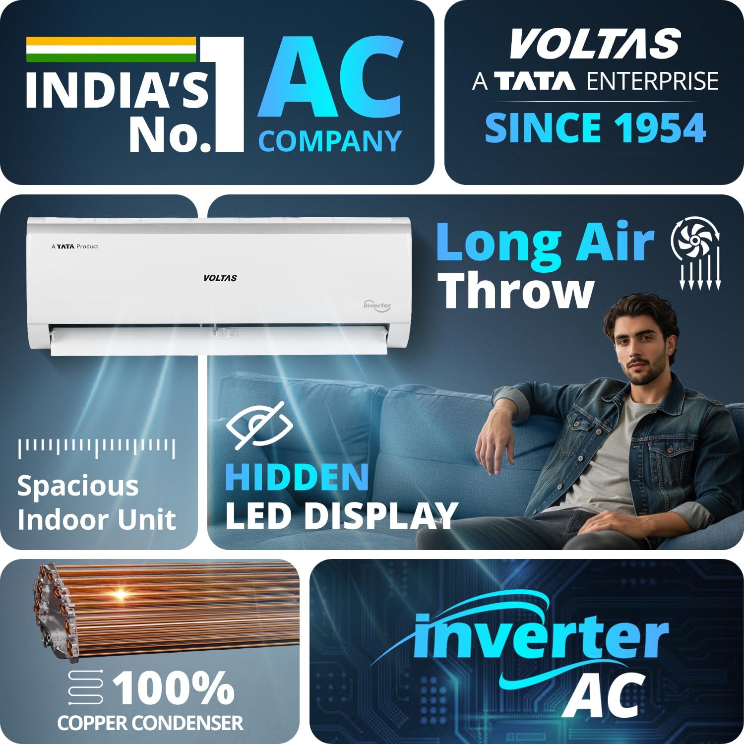 Key Features: Stabilizer free operation within 230 Voltage range; Digital Temperature Display ; Noise Level: 47 / 45 / 43 / 38 dB