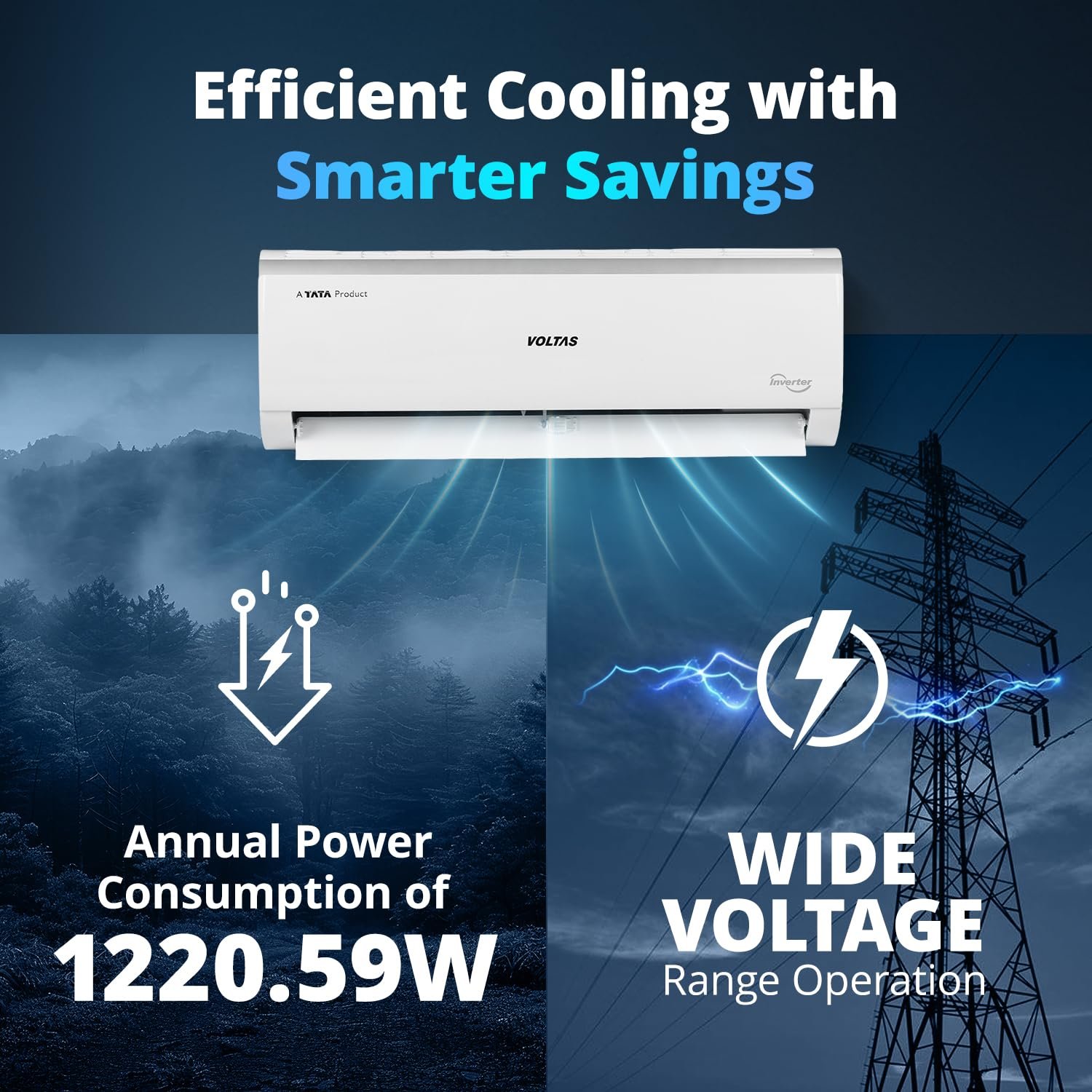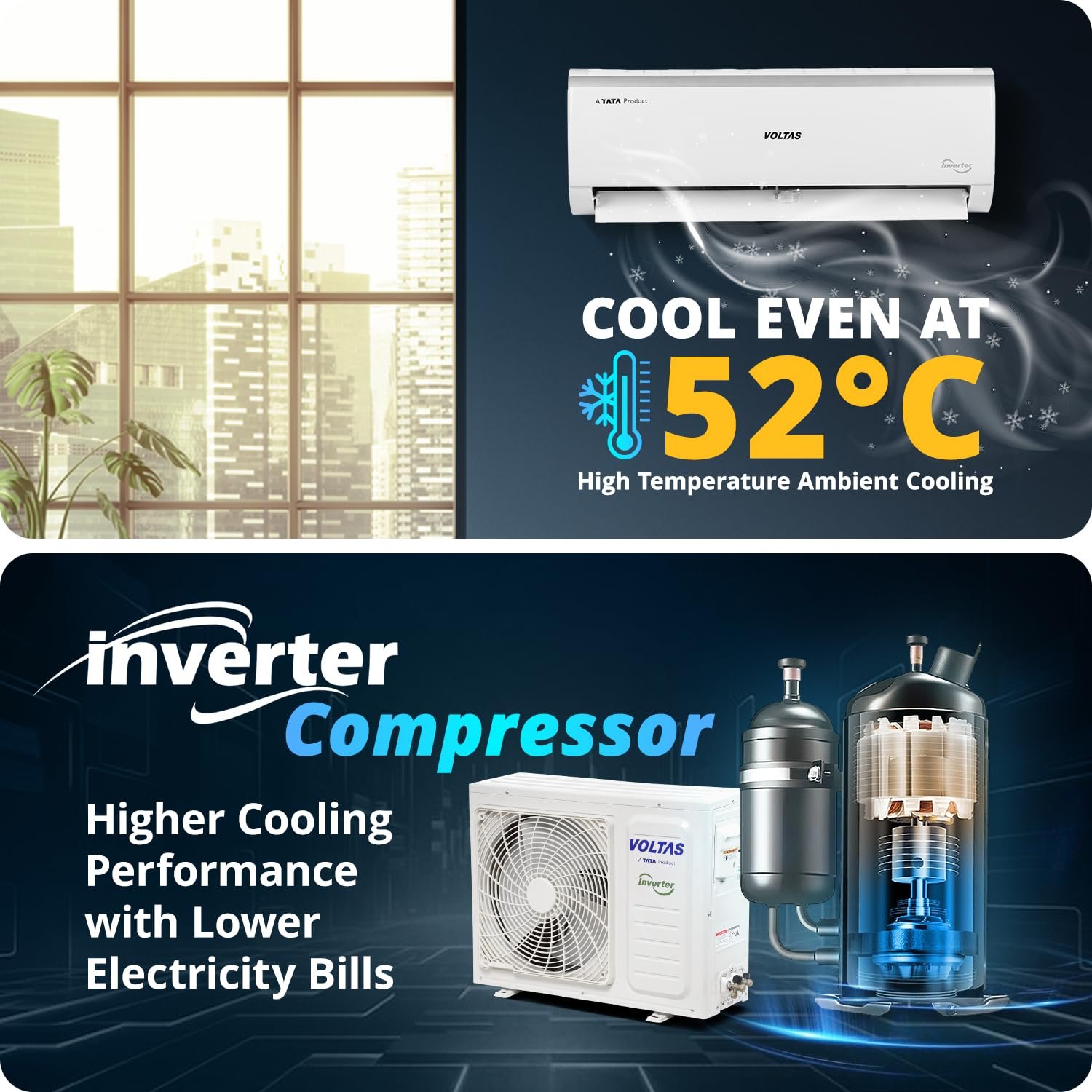 Voltas 243V Vectra Elite 2 ton 3 star inverter Split AC|4-IN-1 Adjustable mode|Energy Efficient|High ambient Cooling-cools even at 52°C|Anti dust filter with Anti-microbial coating|Copper Coil| White